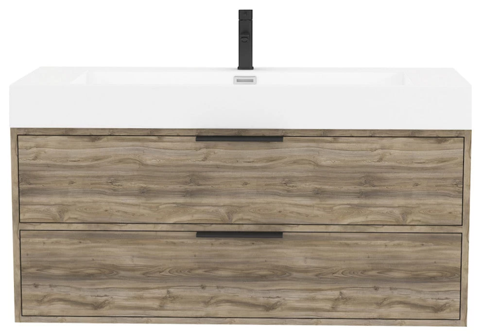 Lead Time: 3 to 7 Weeks The Savoy 2-Drawer Single Vanity offers a sleek, modern look with unique wood grain textures and spacious, soft-close drawers. With a 4-in thick vanity top and integrated sink complete with overflows, this Canadian-made floating vanity is the perfect blend of style and function for your bathroom remodel. Pre-drilled for a single handle faucet, all you need to complete the look is your choice of faucet.