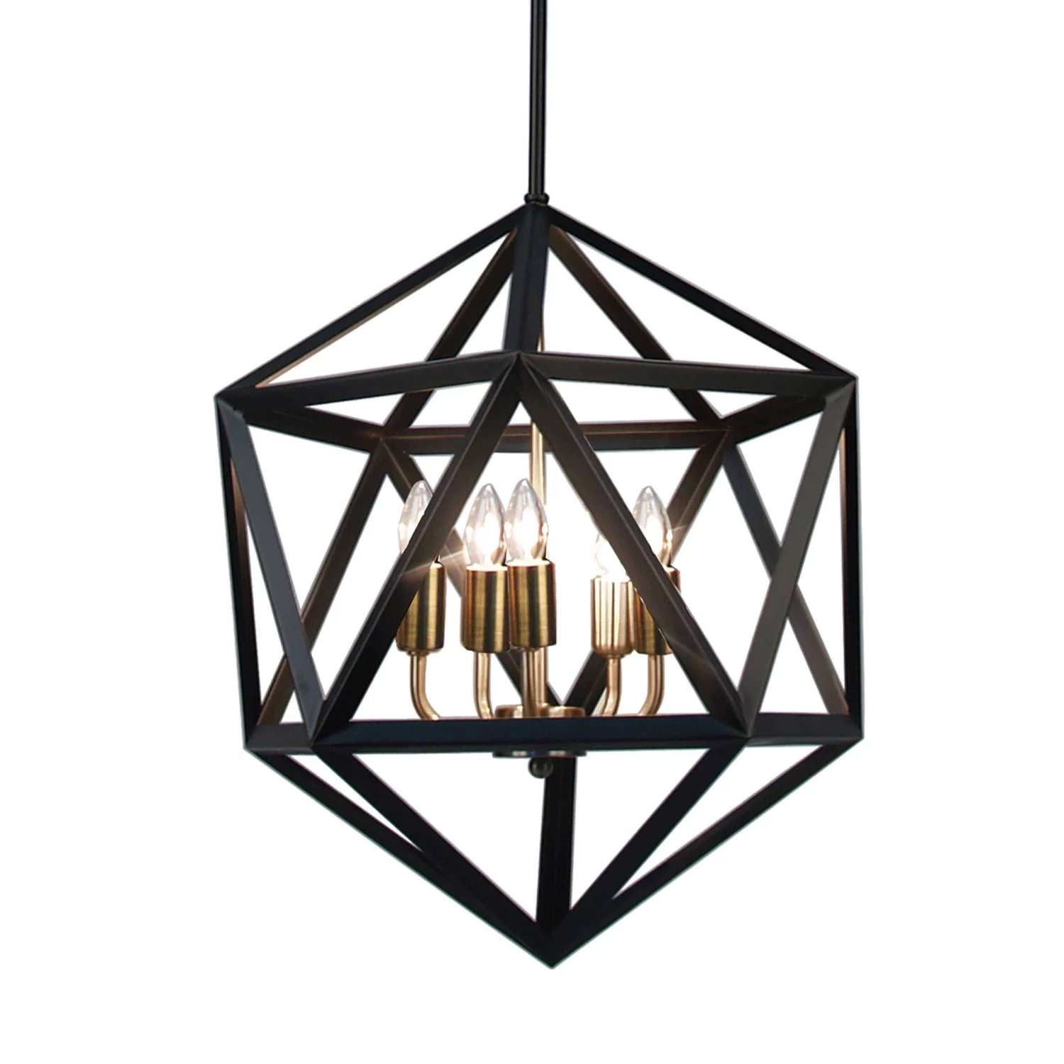 5 Light Chandelier, Matte Black with Antique Brass Accents