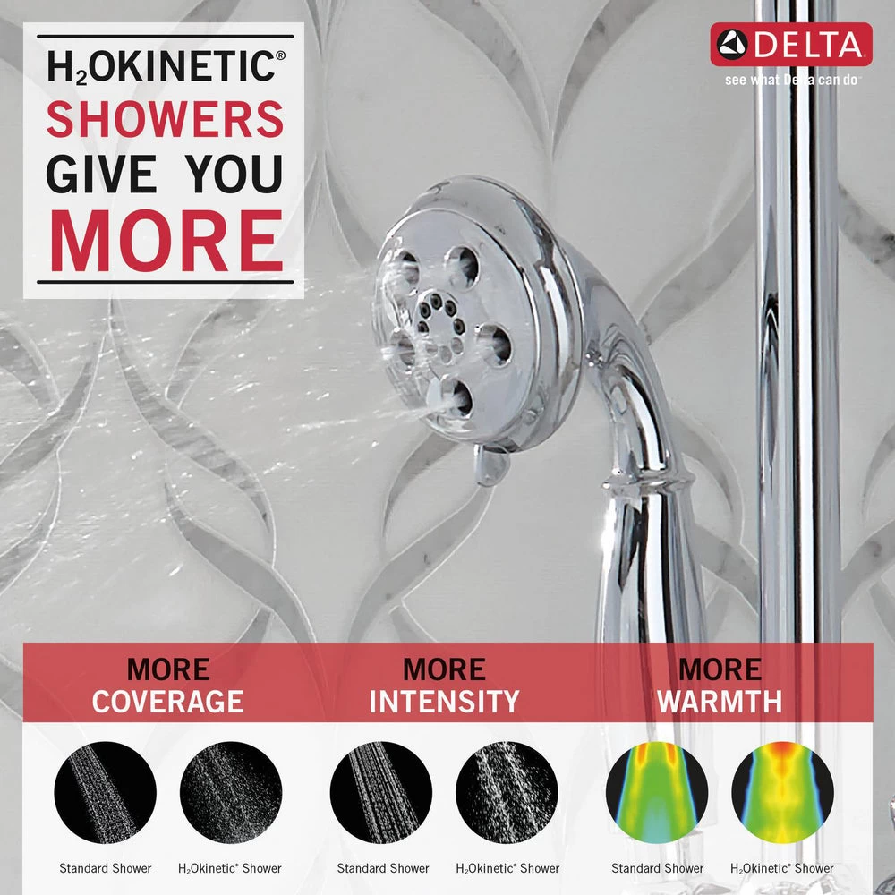 Experience a better shower with the control and flexibility of a Delta hand shower. Great for showering yourself or your loved ones and pets, as well as for keeping your shower and tub clean. Delta H2Okinetic Showers look different because they are different. Using advanced technology, H2Okinetic showers sculpt water into a unique wave pattern, giving you 3X the coverage of a standard shower head.* The end result is a shower that provides more coverage, more warmth and more intensity for a truly drenching shower experience. So go ahead and indulge, because now you can enjoy the feeling of more water without using more water. The pause setting gives you ample space for shaving, lathering and other shower tasks, then easily restarts the water with the temperature where you left off. This spray setting helps you conserve water, so you can worry less about depleting your supply of hot water – and you help the environment too. Delta WaterSense labeled faucets, showers and toilets use at least 20% less water than the industry standard? Saving you money without compromising performance. *Coverage measured in accordance with EPA WaterSense Specification for shower heads, March 4, 2010.