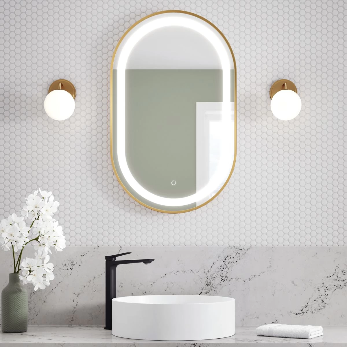LED-illuminated oblong mirror with frosted strip, gold frame and touch-switch for color temperature control.