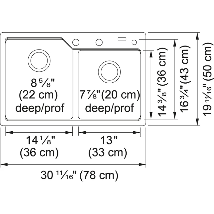 - Overall Dimensions: 30.69-in left-to-right x 19.69-in front-to-back; Large Interior Bowl Dimensions: 14.13-in left-to-right x 16.75-in front-to-back; bowl depth: 8.63-in; Small Interior Bowl Dimensions: 13-in left-to-right x 14.38-in front-to-back; bowl depth: 7.88-in; Fits minimum cabinet size 33-in