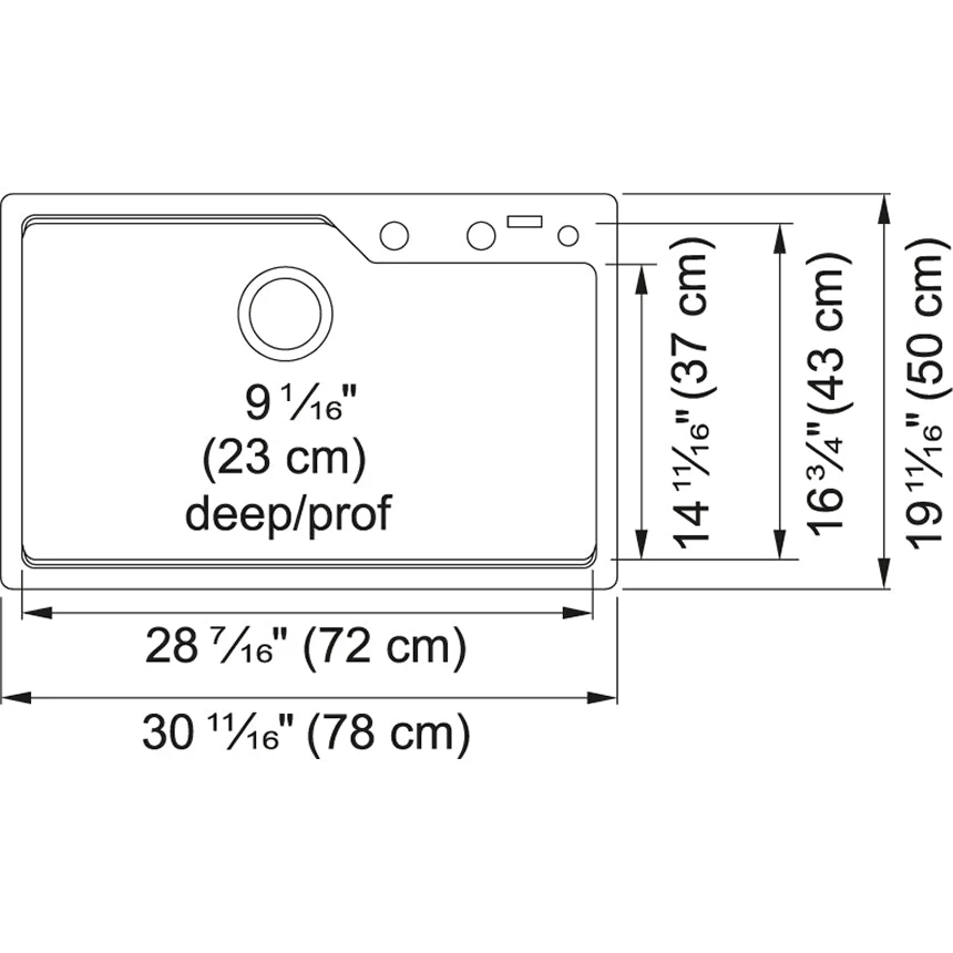 - Overall Dimensions: 31.69-in left-to-right x 19.69-in front-to-back; Interior Bowl Dimensions: 28.44-in left-to-right x 16.75-in front-to-back; Bowl Depth: 9.06-in; Fits minimum cabinet size 33-in