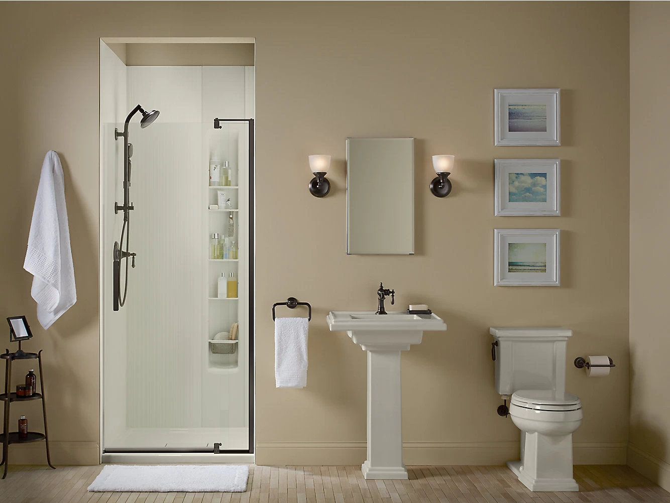 - Two adjustable tempered-glass shelves offer additional bathroom storage.