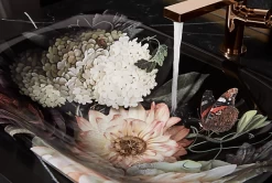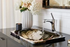 The Dutchmaster collection captures the movement and lush beauty of flowers, bringing bold artistic photography to the bathroom sink. Kohler collaborated with “florography” artist Ashley Woodson Bailey to create this exquisite floral composition. Inspired by Dutch master paintings of the 17th century, the glorious pattern is abloom with peonies, dahlias, ranunculus, and hydrangea, dramatically lit on a dark backdrop in the style of chiaroscuro painting. Rendered on the graceful contours of the Carillon vessel sink, Dutchmaster stands as a bold statement piece in the bath.