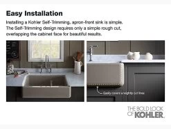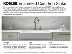 The Whitehaven apron-front kitchen sink features a streamlined and versatile farmhouse style to complement any decor. A large single basin accommodates large pots and pans, while the sloped bottom helps with draining and cleanup. Crafted from enameled cast iron, this sink resists chipping, cracking, or burning for years of beauty and reliable performance. A standard apron front makes it easy to install on 36-inch apron-front cabinetry. The Self-Trimming® design requires only a simple rough cut, overlapping the cabinet face for beautiful results.