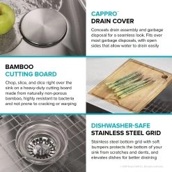 - DRAIN ASSEMBLY WITH COVER: Premium stainless steel drain assembly with strainer keeps debris out of the drainpipe. CapPro™ decorative drain cover conceals drain opening and garbage disposal for a seamless look