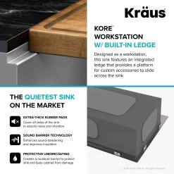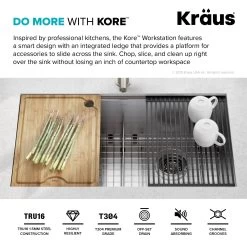 Do more with Kore™ – The ultimate sink for the modern home chef. Inspired by professional kitchens, the Kore™ Workstation Series instantly transforms your kitchen sink into a full-service prep station. Packed with premium accessories such as the multi-purpose dish drying rack and bamboo cutting board, the ultra-functional design of the integrated ledge system allows you to wash and dry, or chop and slice without losing an inch of counter space. Made with real 16-gauge stainless steel, this kitchen workhorse is one of the toughest and most durable sinks on the market. The advanced modern look and culinary-inspired design is an instant upgrade to any home kitchen. Available in a range of sizes, from 17-inch bar sink to an oversized 45-inch workstation with an expanded range of accessories, Kore™ offers the perfect solution for any space. Take the functionality of your kitchen sink to a whole new level with the Kore™ Workstation Series, and experience the Kraus difference.