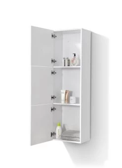 The Cabinet features three doors with push-open operation and three large storage areas to store bathroom essentials. It is perfect to store large towels and tall bottles. It matches nicely with any same finish Vanity.