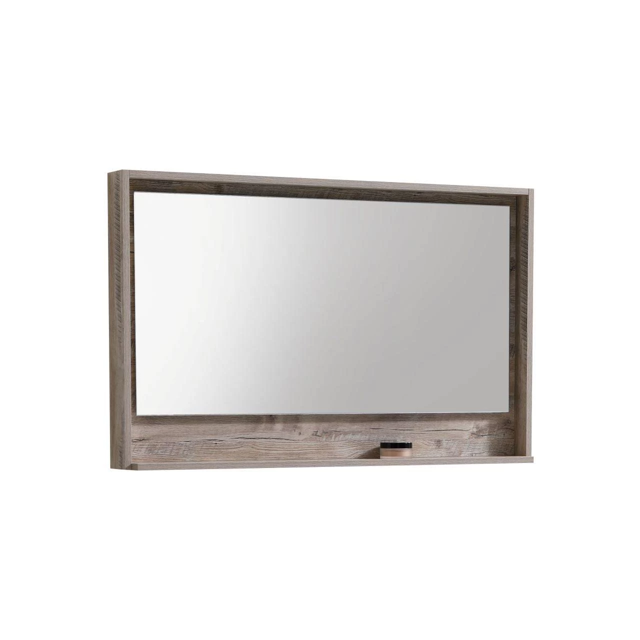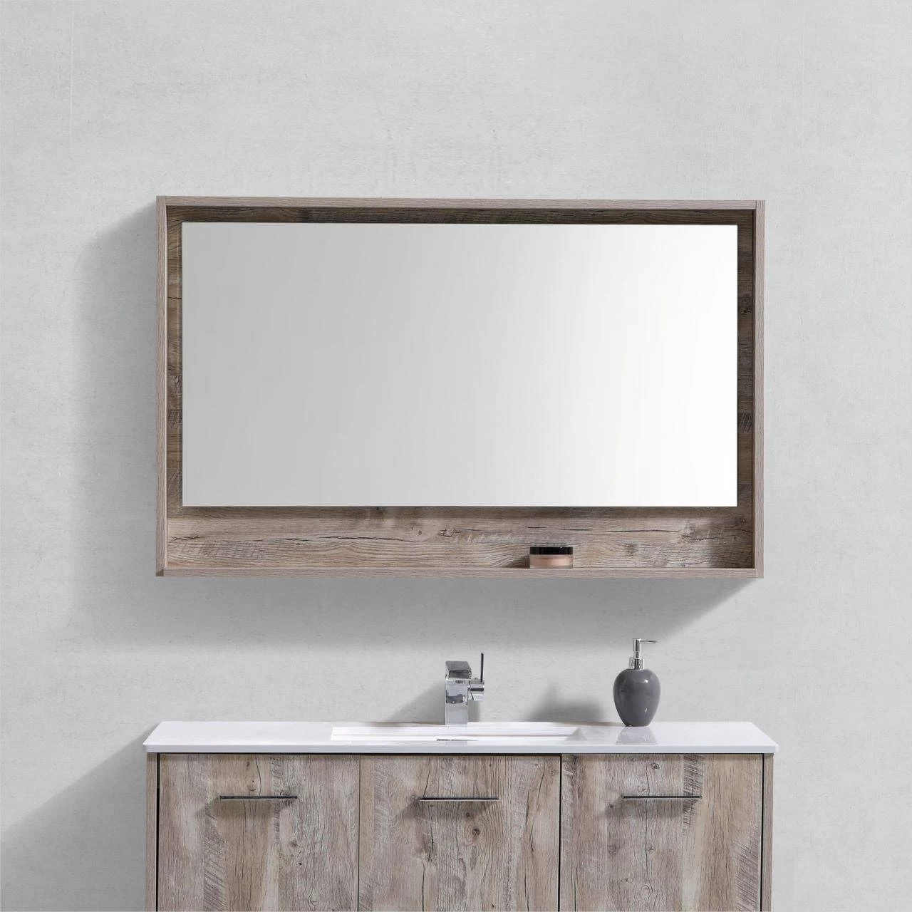 Our Bosco Mirrors match perfectly our Bosco Vanity line and will add great additional to your Bathroom. This Mirror features a shelve and matching frame all around the Mirror.