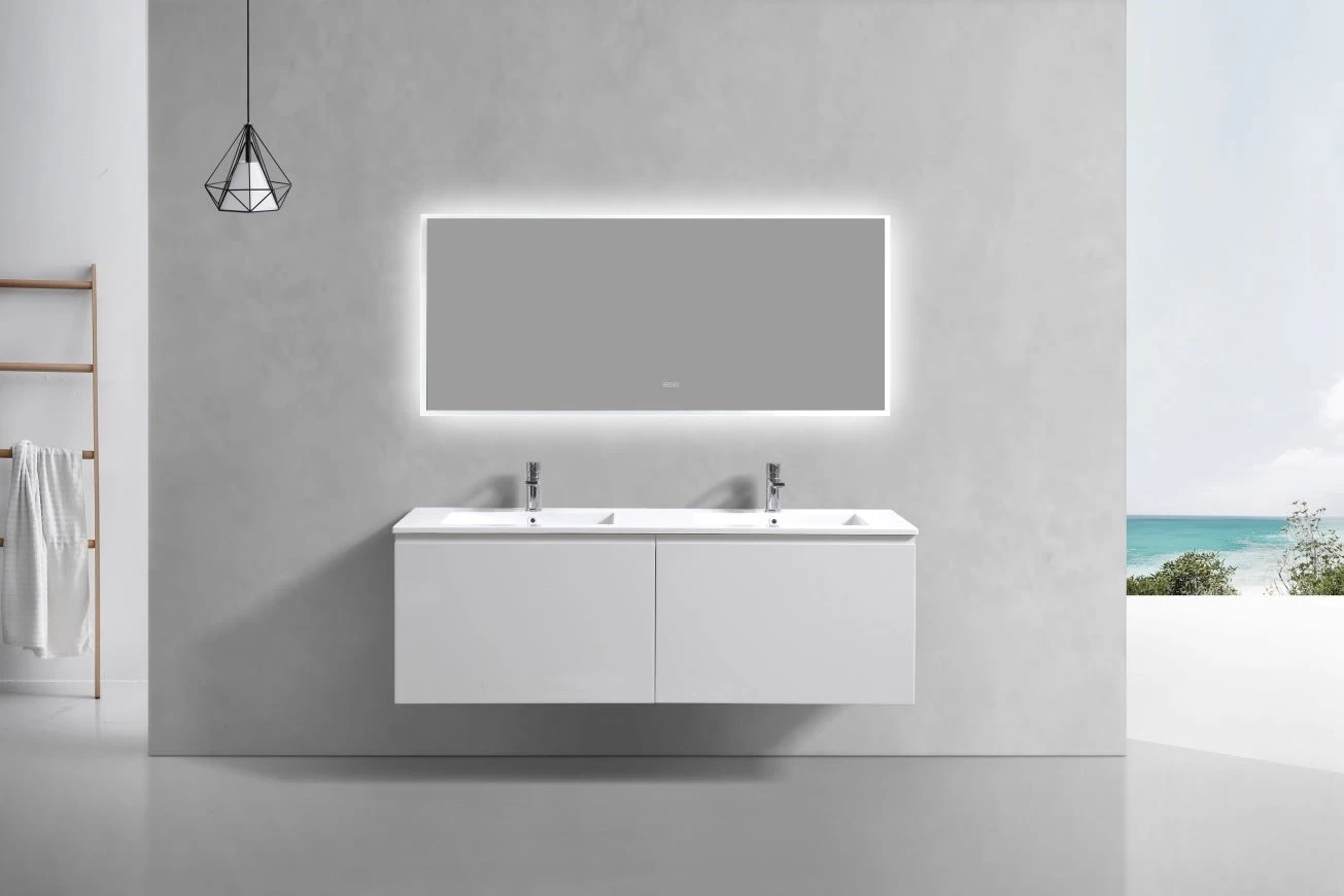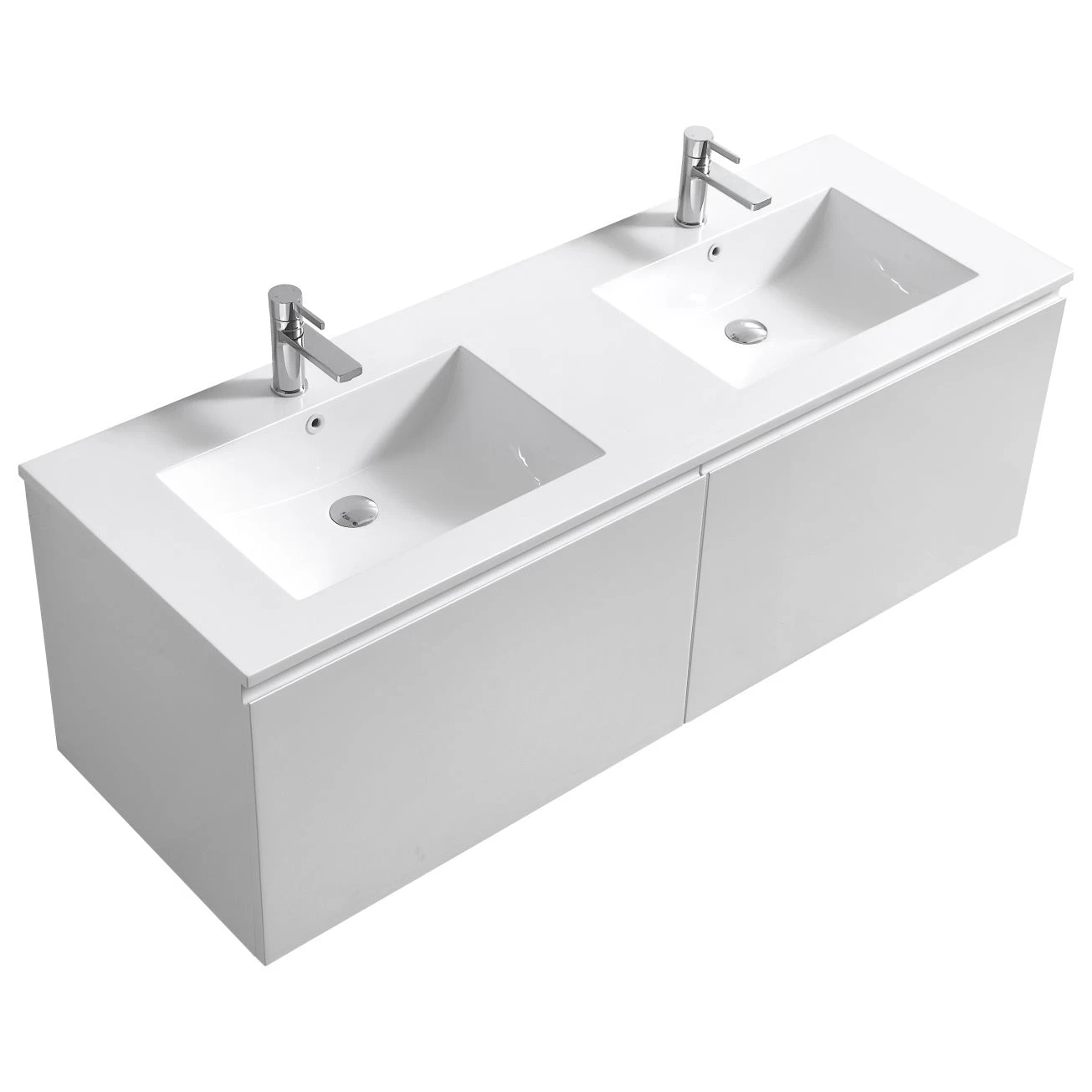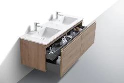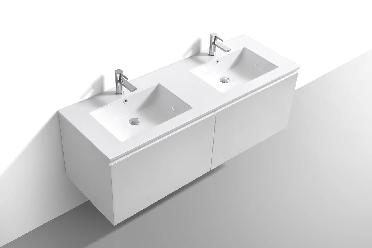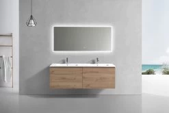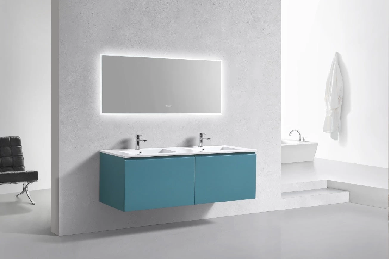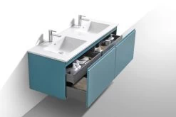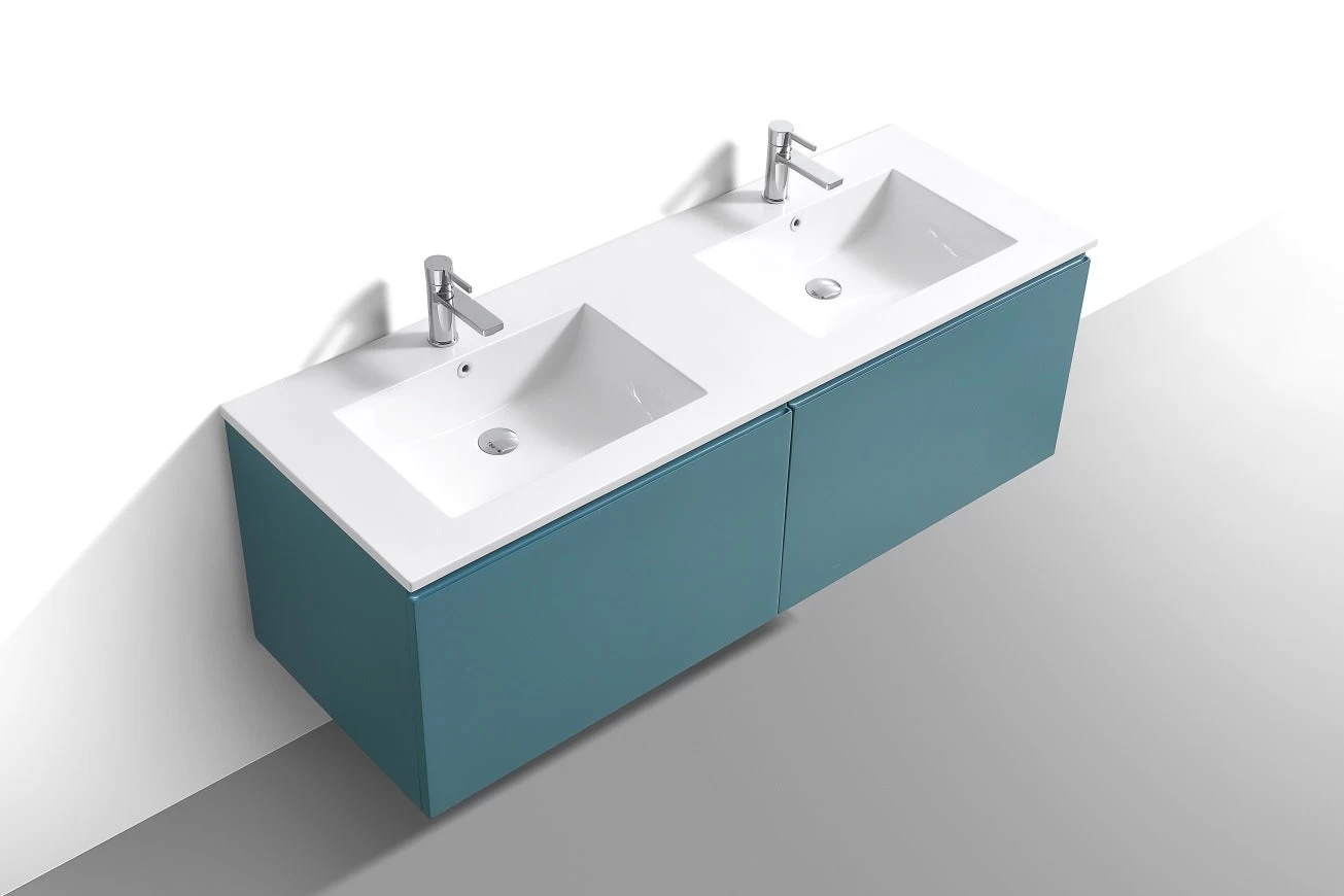 This Floating Wall-Mounted bathroom vanity features the large cupboard with one spacious drawer and one inner drawer for storing bathroom essentials. The clean, contemporary lines are enhanced by a crisp white integrated sink. Available in Gloss White, White Oak and Teal Green Finishes.