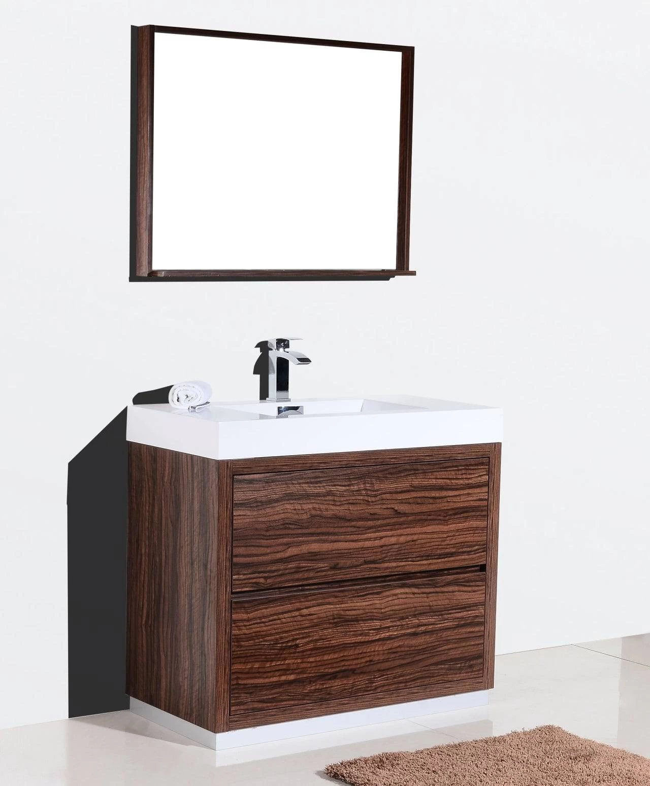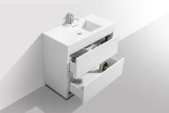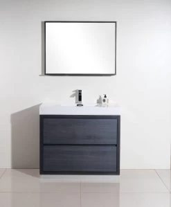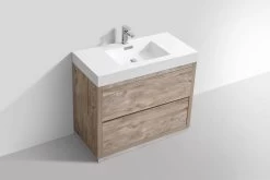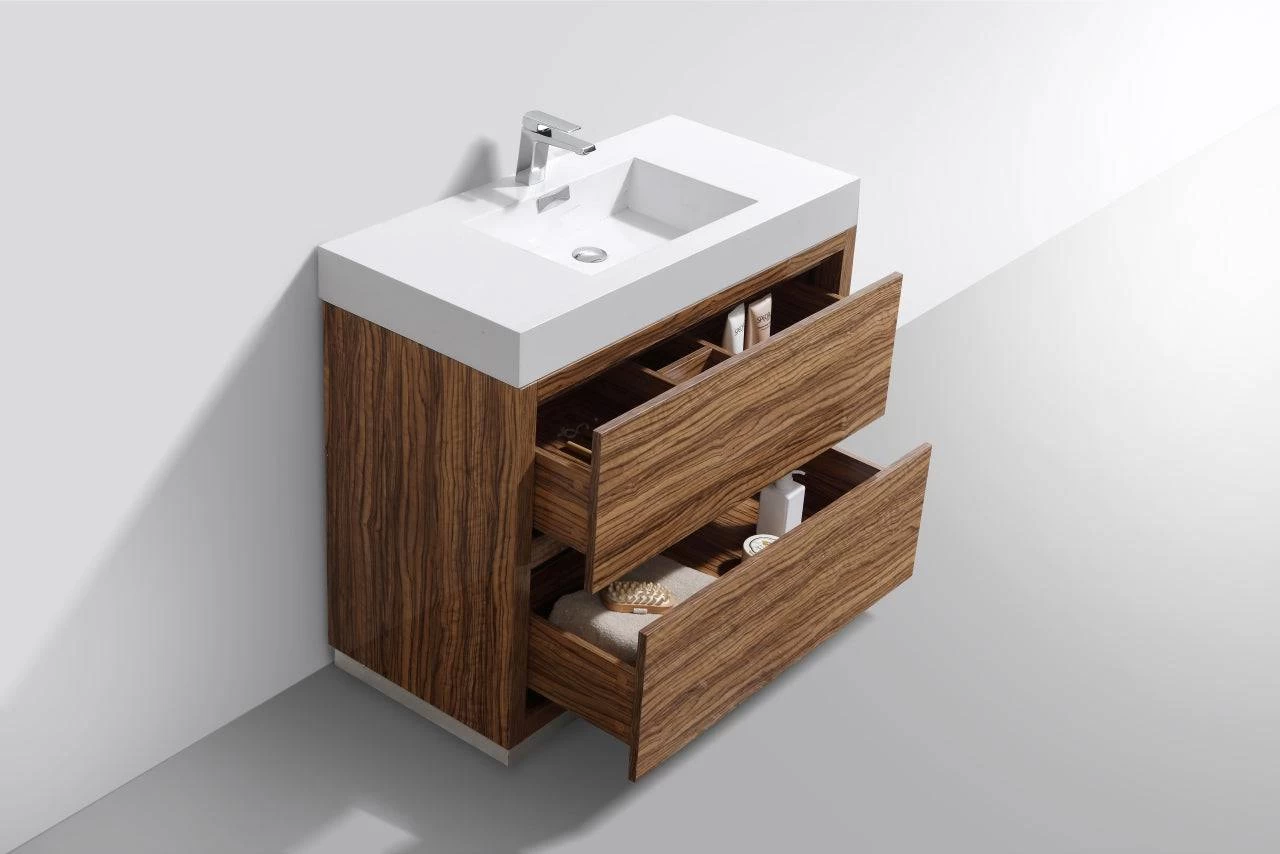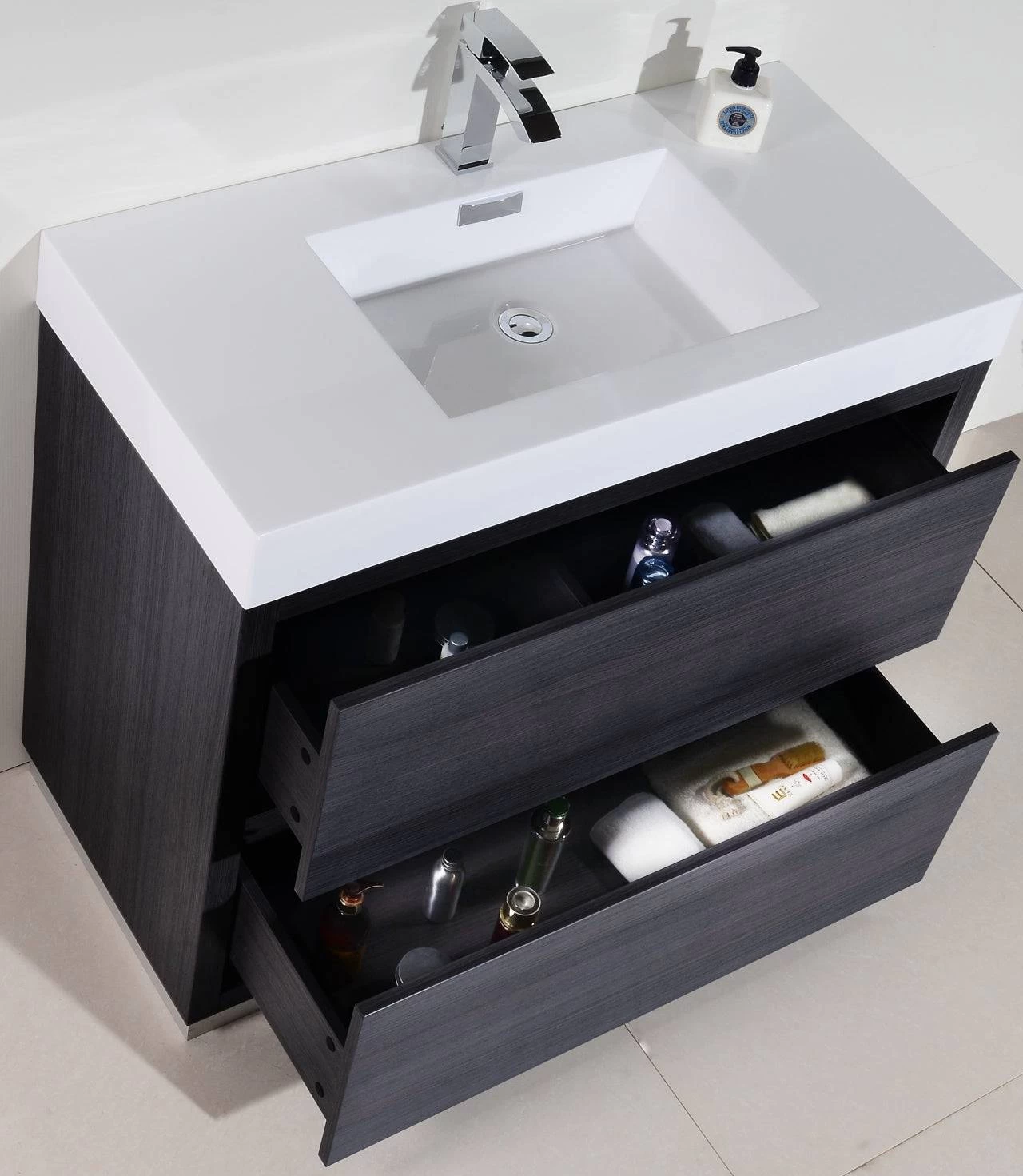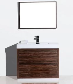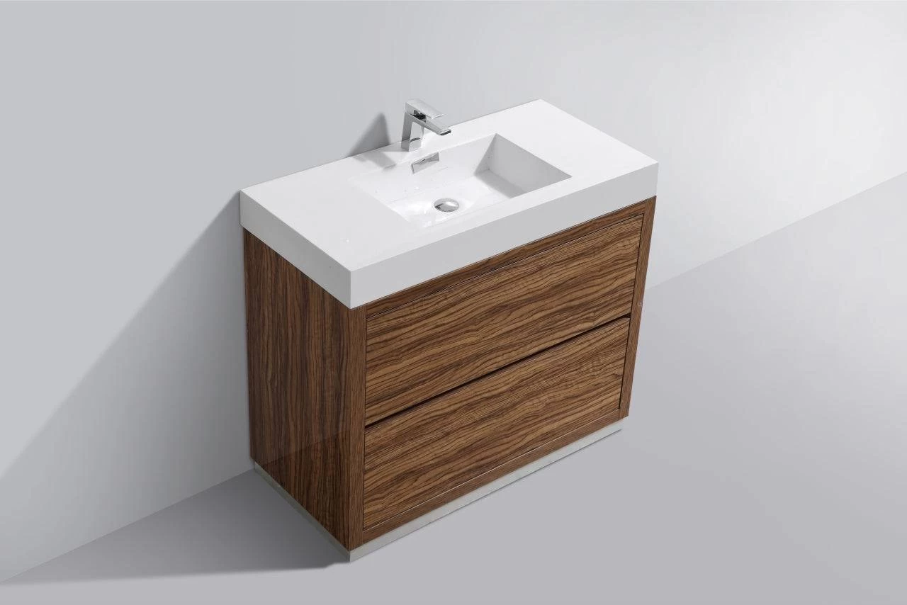 The Bliss is one of the most elegant modern Bathroom Vanities around. This 40 Inch model comes with a reinforced Acrylic sink, Marine Wood Veneer Constructed Console that is fully moister and water proof, with high quality European DTC Hardware, that provides smooth push-open operation drawers. Colors- Black, Butternut, Chestnut, Gray Oak,, High Gloss White, Natural Wood, Walnut