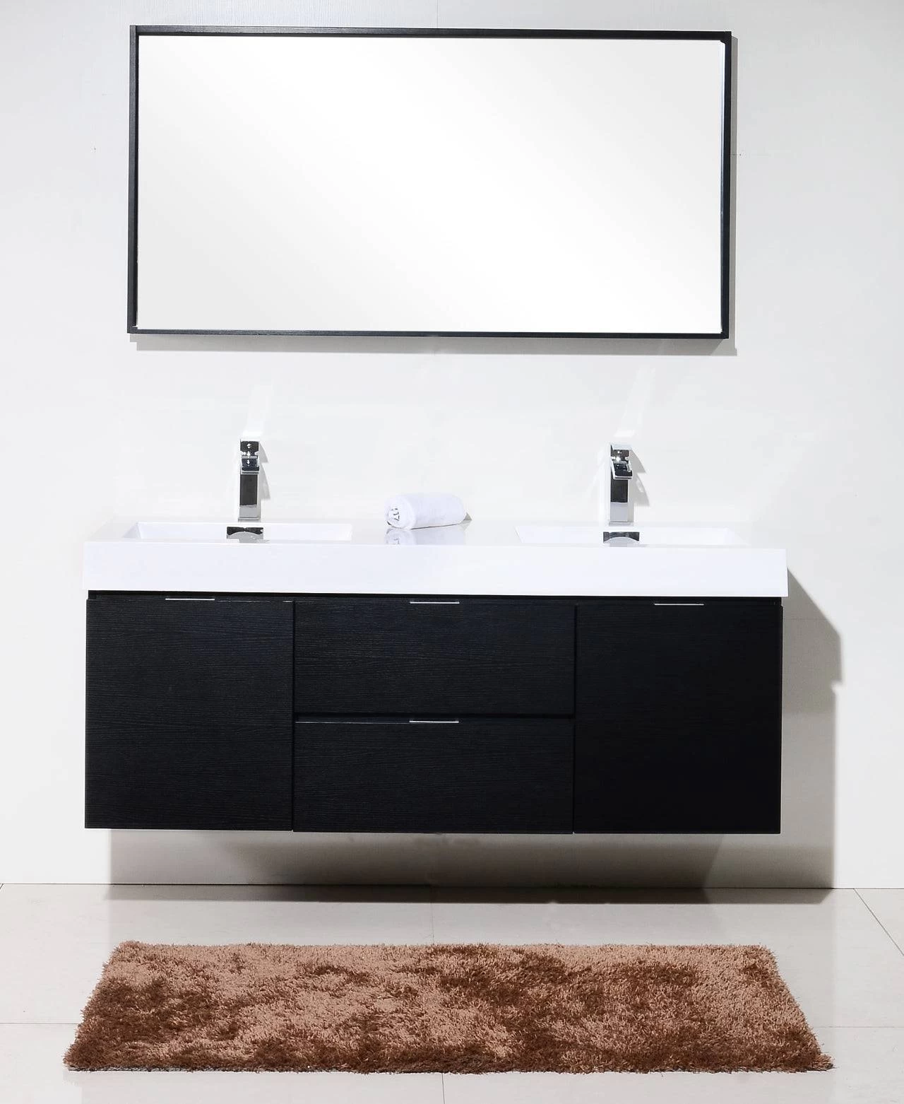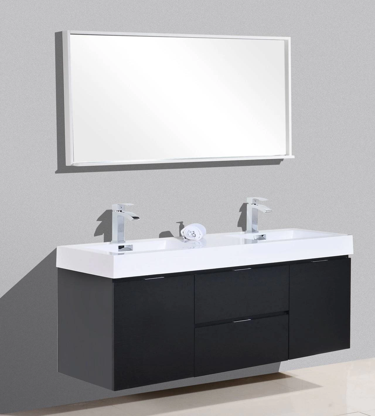The Bliss is one of the most elegant modern Bathroom Vanities around. This 60-inch model comes with a reinforced Acrylic sink, Marine Wood Veneer Constructed Console that is fully moister and waterproof, with high-quality European DTC Hardware, that provides smooth soft-closing operation drawers. Colors – Black, Butternut, Chestnut, Nature Wood, Walnut, High Gloss White, High Gloss Gray Oak, Gray Oak, Turquoise Green.