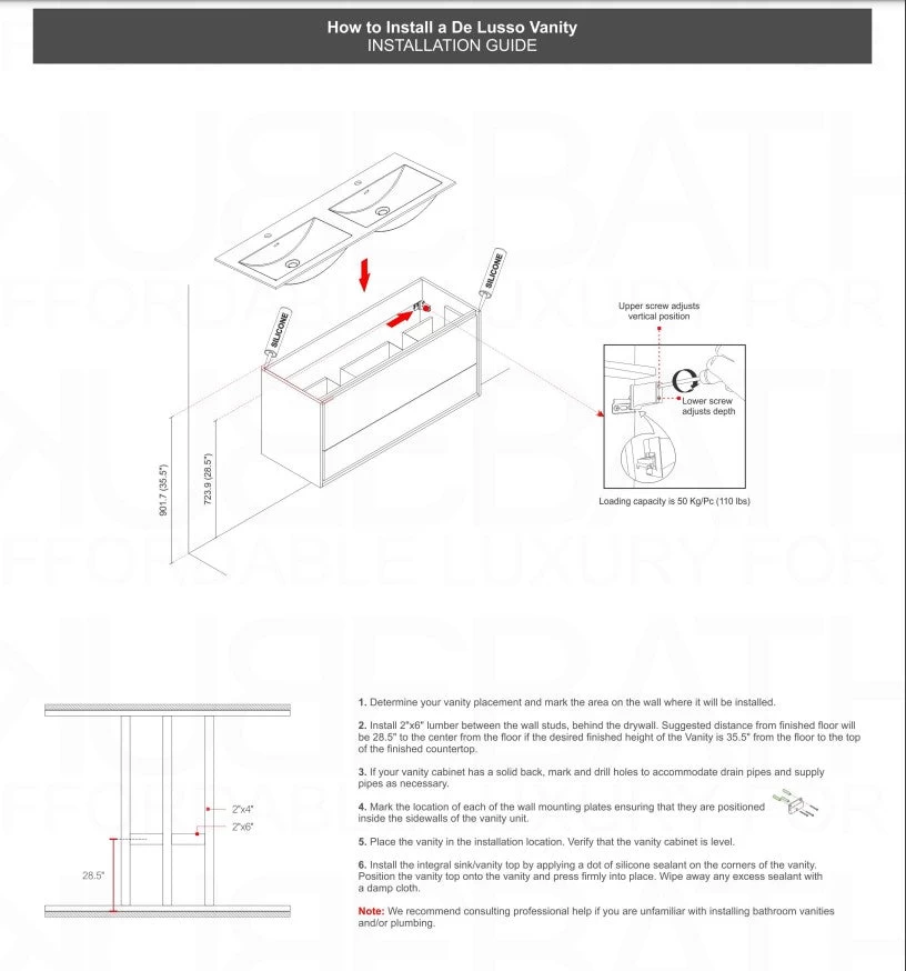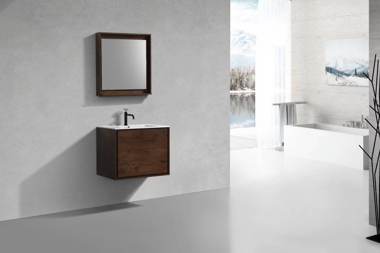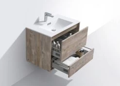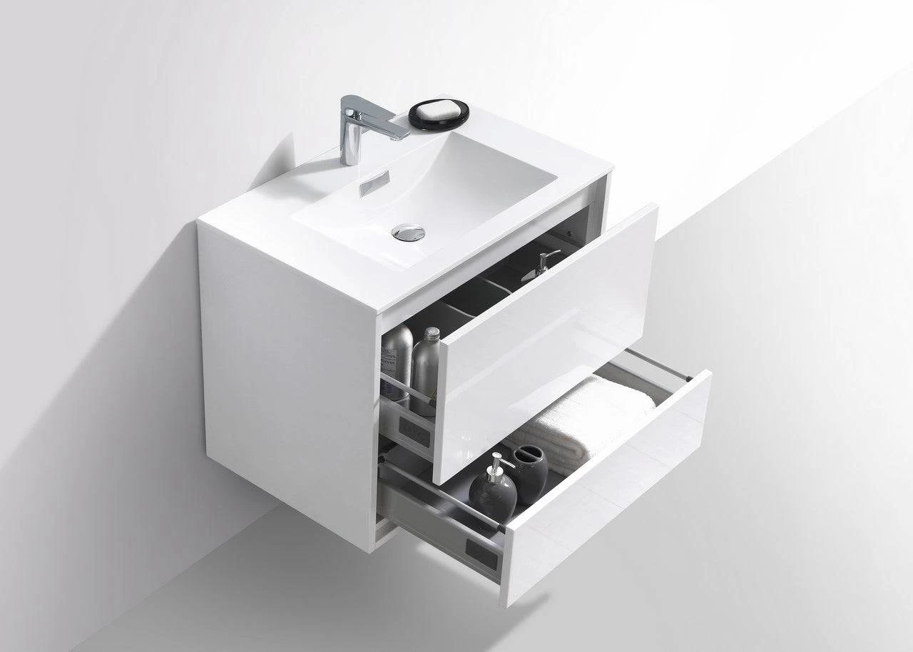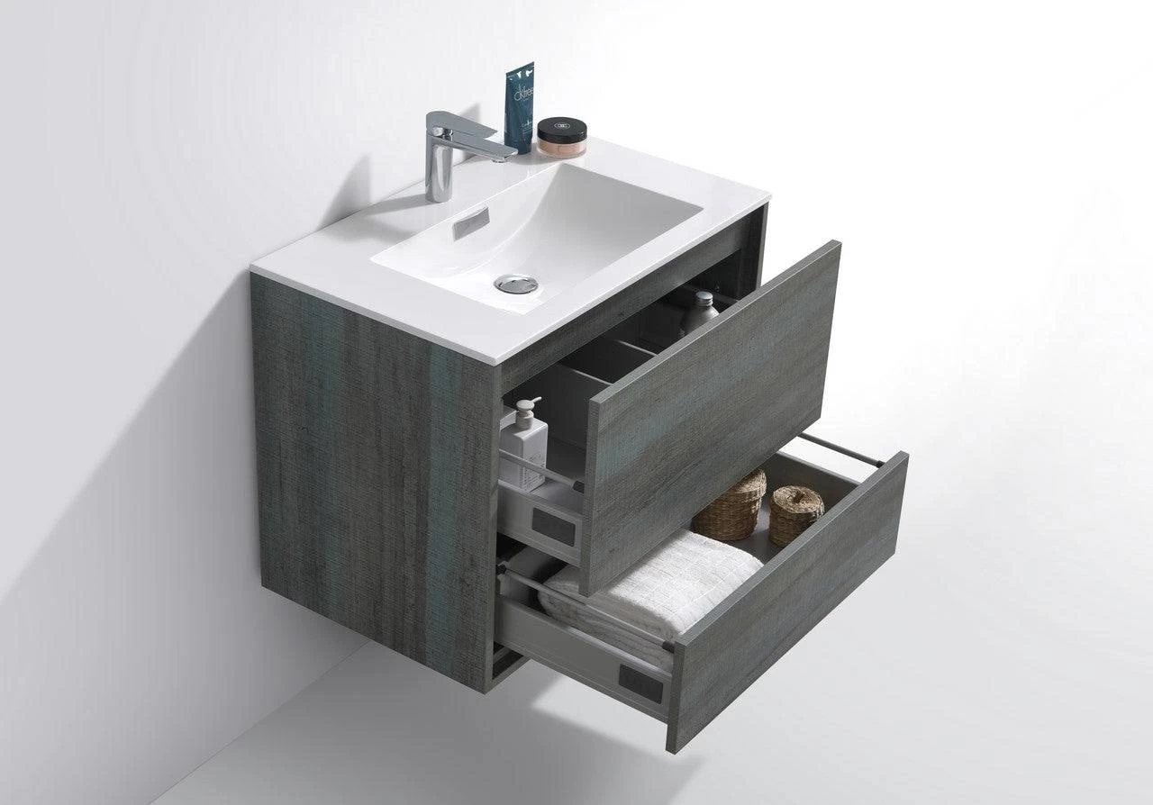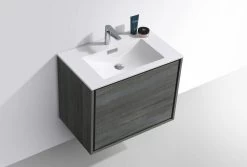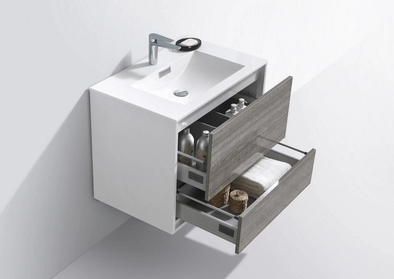 De Lusso Vanity by KubeBath is a minimalist piece you’ll cherish for years. Ingenious, this Vanity has two push-open drawers, perfect to store bathroom essentials and features a white reinforced Acrylic Countertop with integrated Sink, with crisp clean lines, pre-drilled for a single hole Faucet. An easy-to-care-for item that will add a modern touch to your Bathroom for a refreshing sleek look. Colors- Ocean Gray, Nature Wood, High Gloss White, Ash Gray.