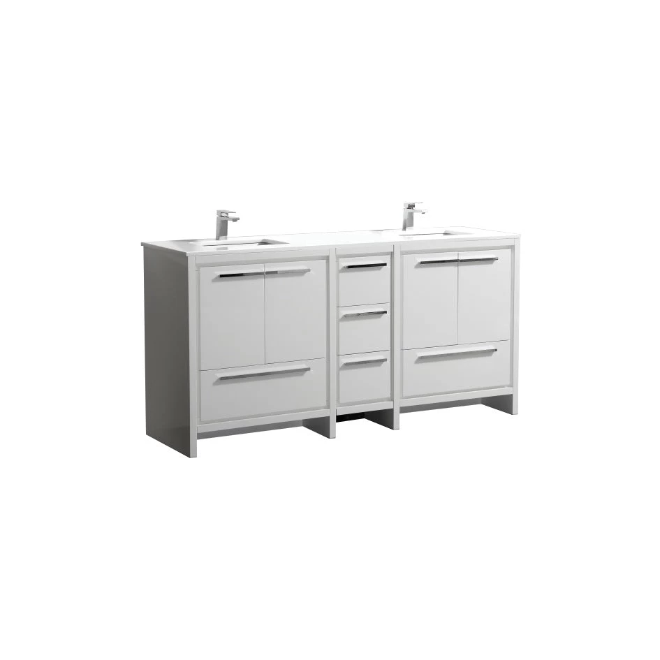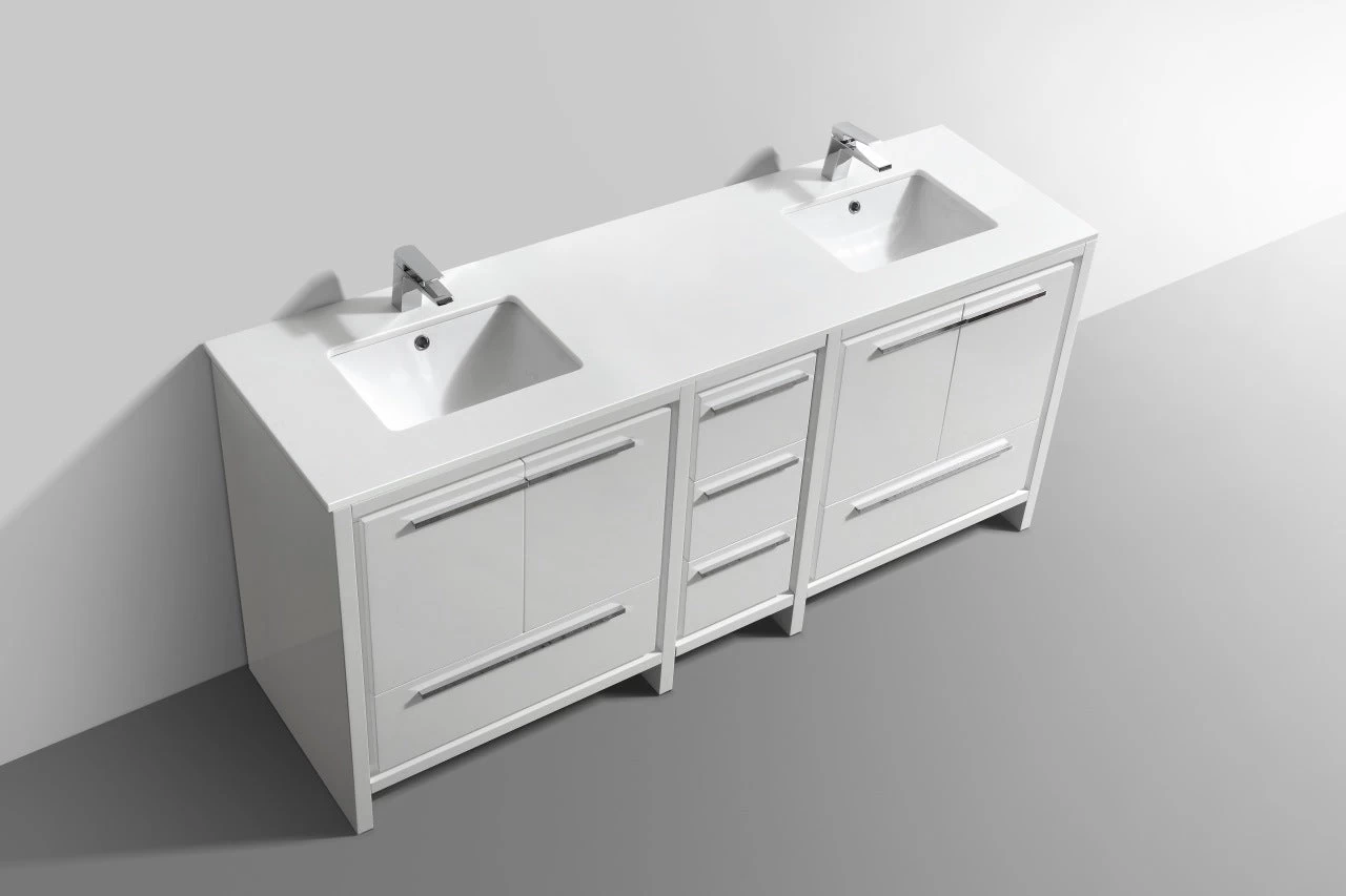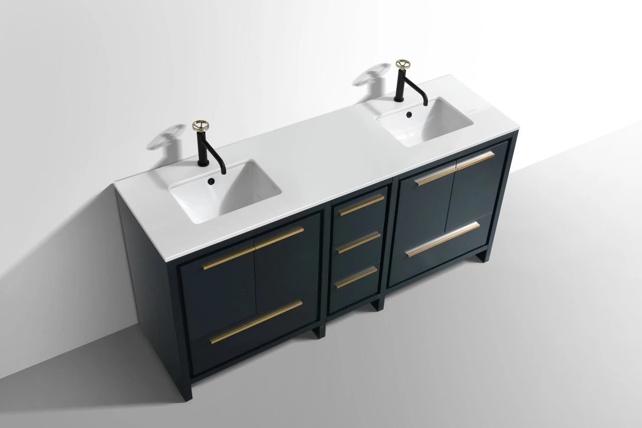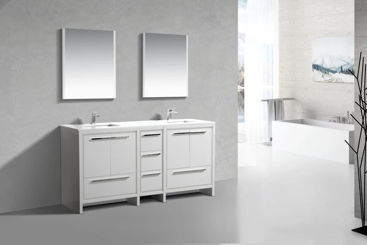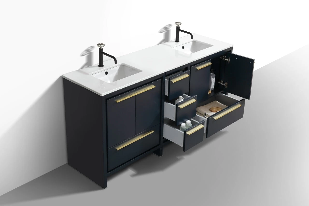 The Dolce Vanity by KubeBath is one of the most elegant modern Bathroom Vanities around. This 72 Inch double sink model comes with a durable pure Quartz Countertop and features four Doors and five Drawers with high-quality European Hardware, that provides smooth soft-closing operation. Top Drawer features push-open operation.