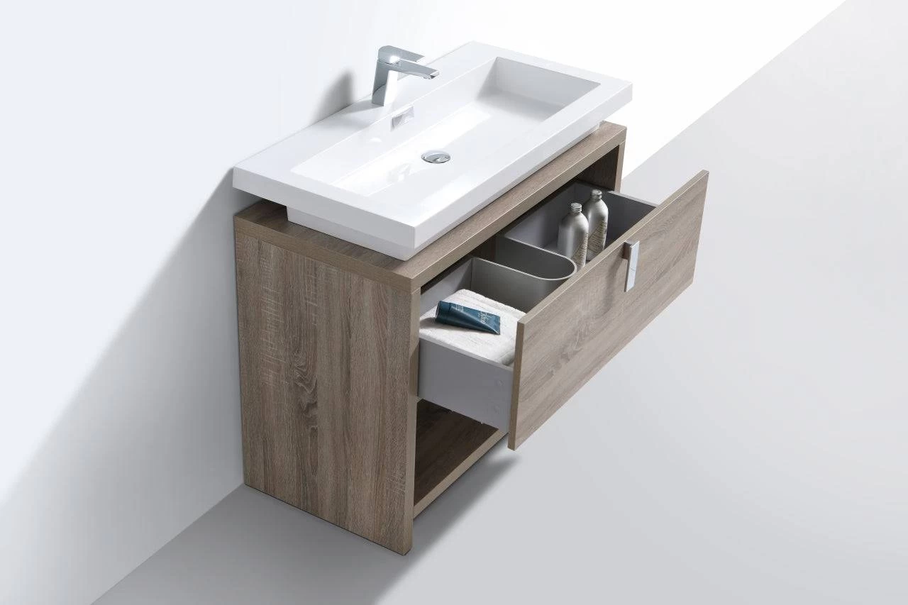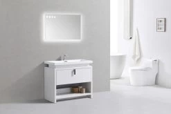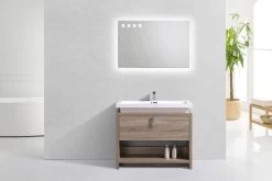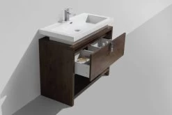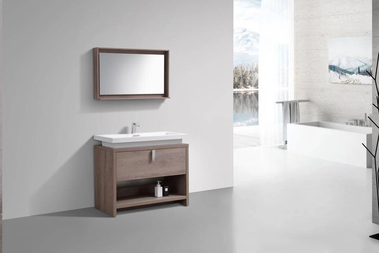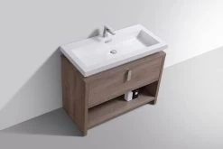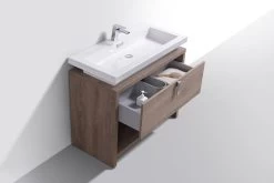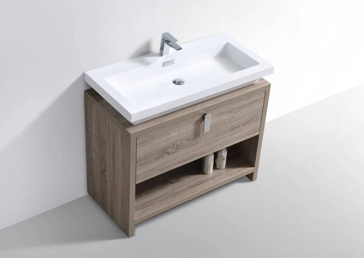 The Levi free standing bathroom vanity by KubeBath features one drawer for storing bathroom essentials. The clean, contemporary lines are enhanced by a crisp white integrated sink. Colors – Butternut, Ash Gray, High Gloss White, Havana Oak, Rose Wood.