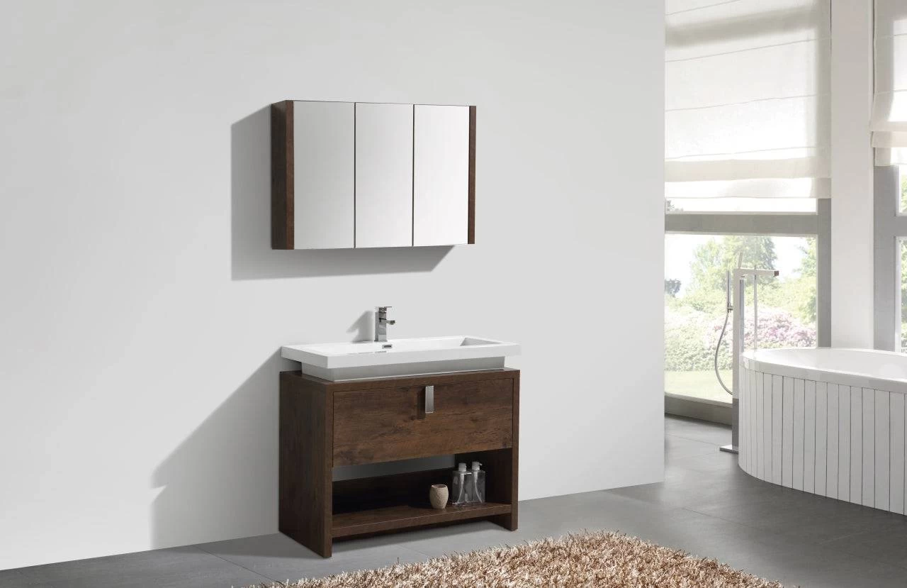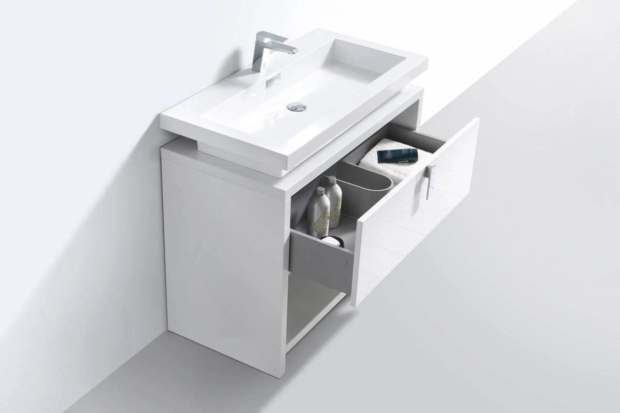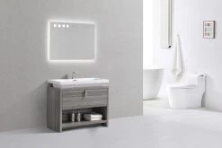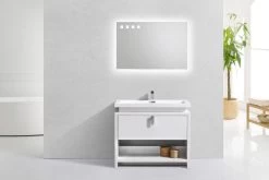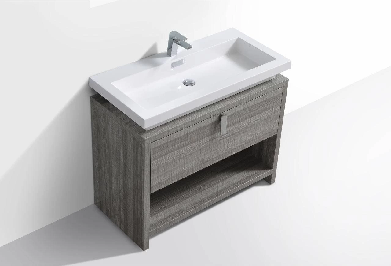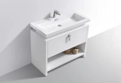The Levi free standing bathroom vanity by KubeBath features one drawer for storing bathroom essentials. The clean, contemporary lines are enhanced by a crisp white integrated sink. Colors – Butternut, Ash Gray, High Gloss White, Havana Oak, Rose Wood.