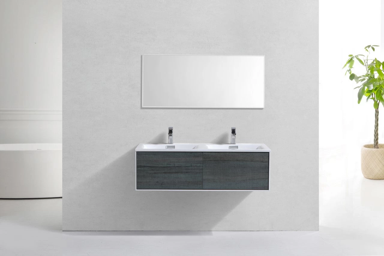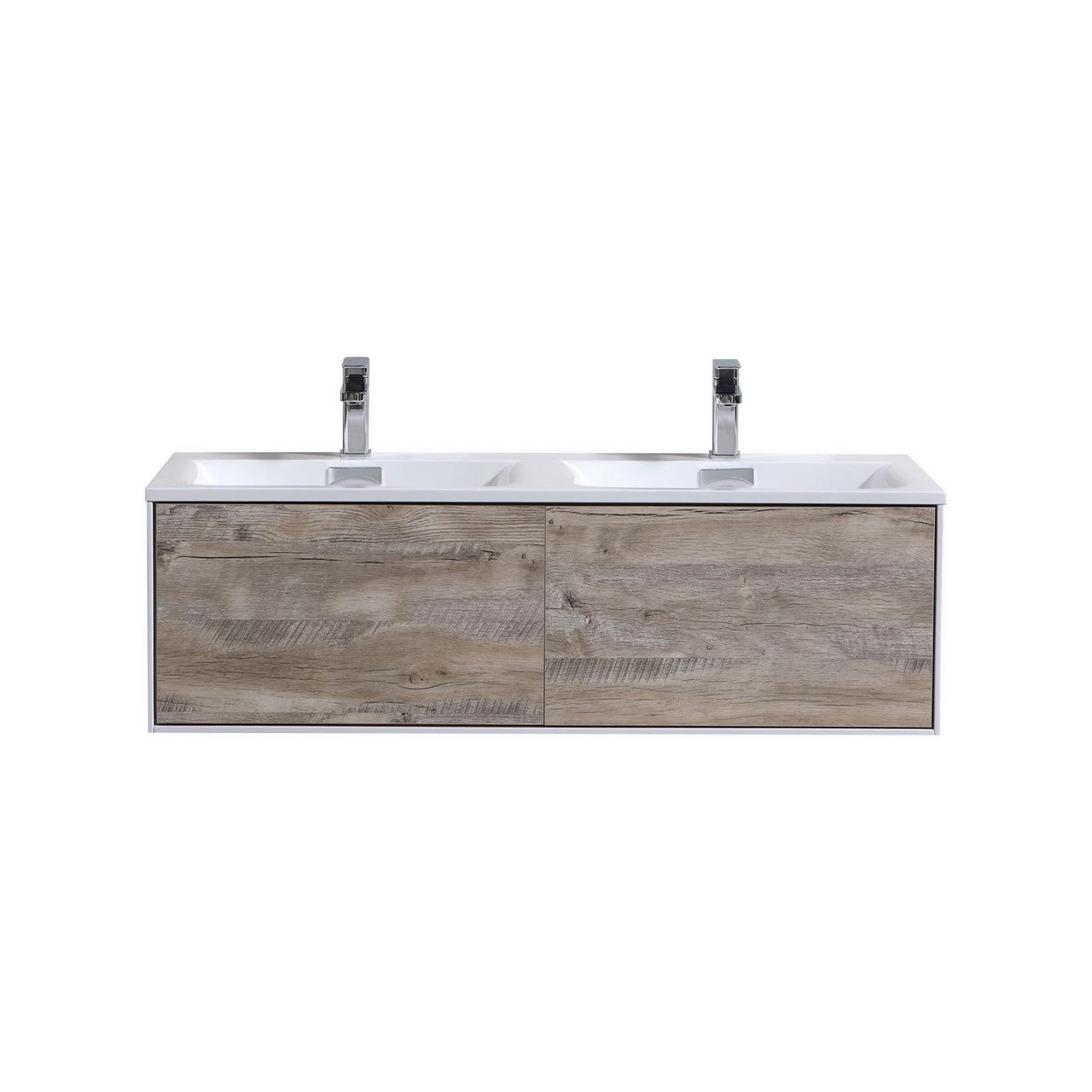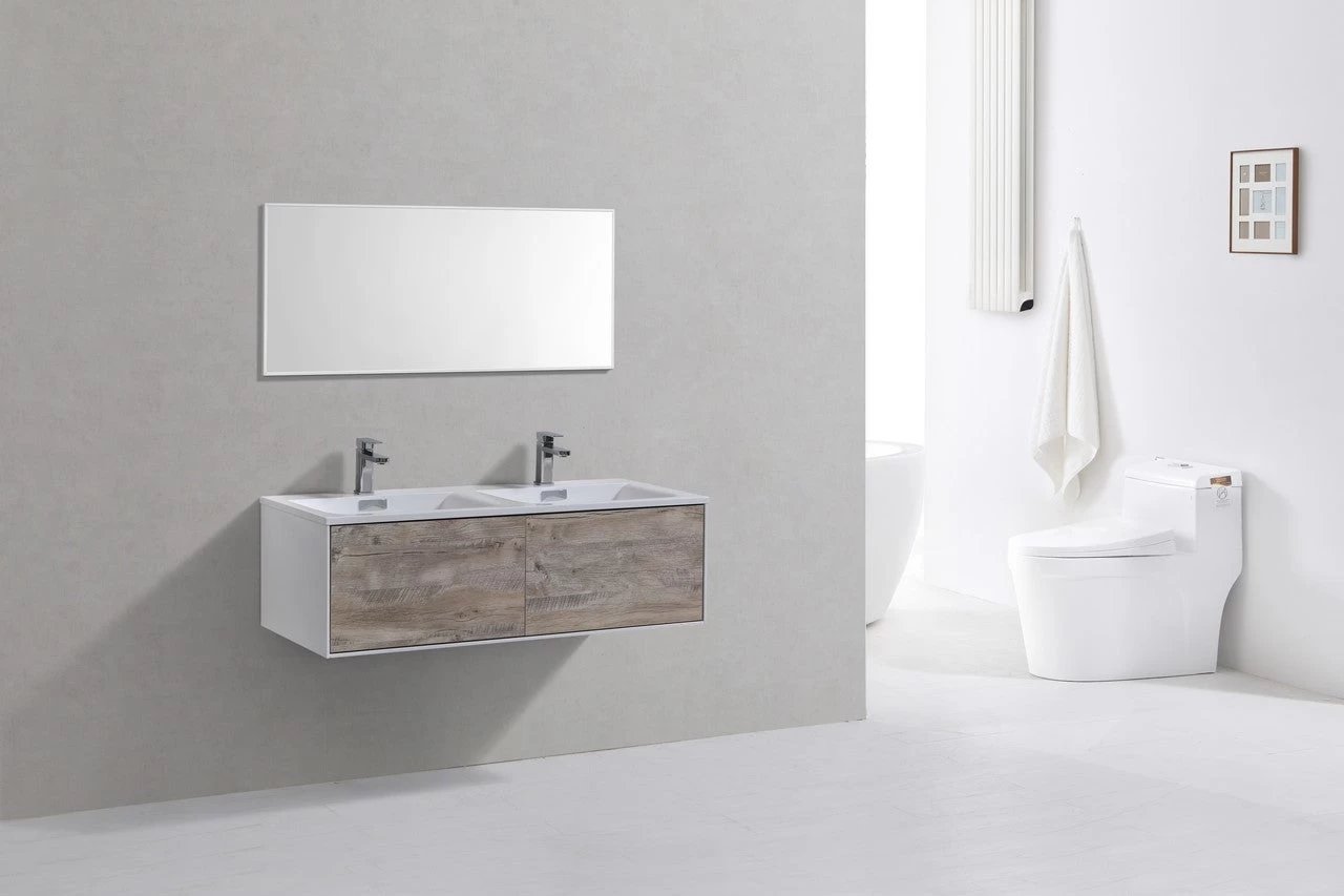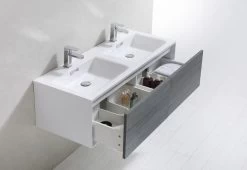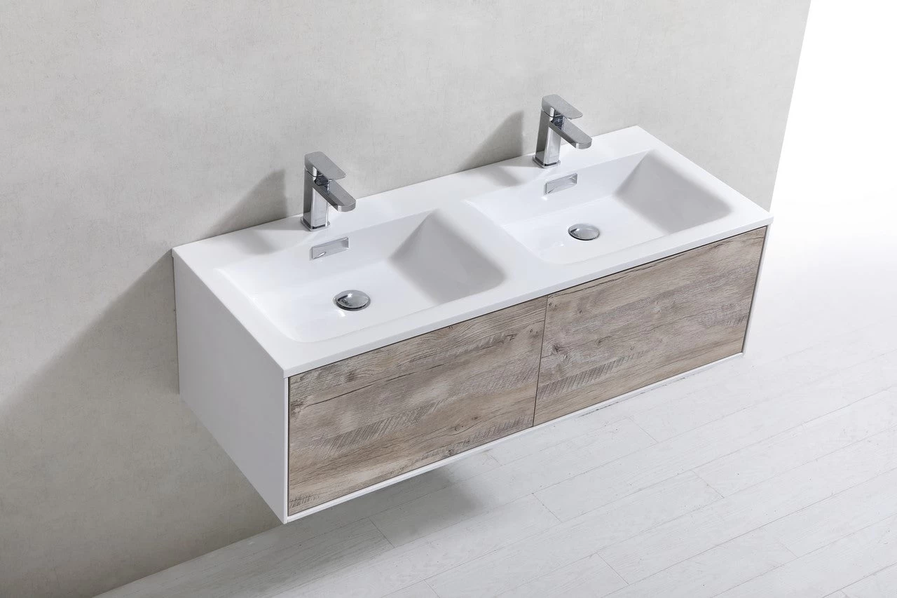 The Divario floating wall-mounted bathroom vanity features two spacious drawers for storing bathroom essentials. The clean, contemporary lines are enhanced by a crisp white integrated sink, High Gloss White finished sides and Nature Wood drawers front finish.