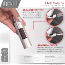 Ceramic disc cartridge: NSF certified Kerox cartridge for lasting drip-free use. Durable for 500,000 times’ life cycle test. Neoperl aerator: reduces water waste without sacrificing pressure. Pull down two function sprayer: Easily and ergonomically switch from spray to stream. Aerated stream is perfect for filling water and spray mode is perfect for rinsing. With the pull-down sprayer you can easily access the entire sink area.