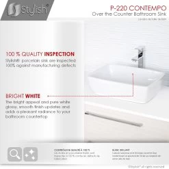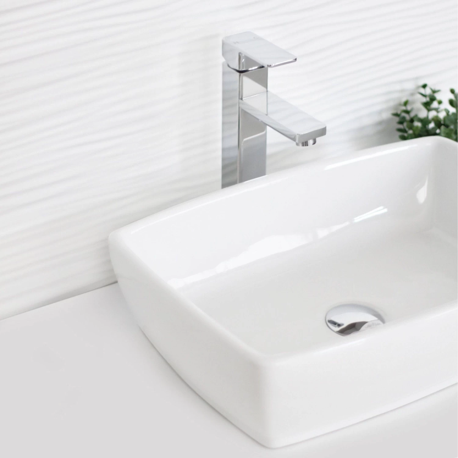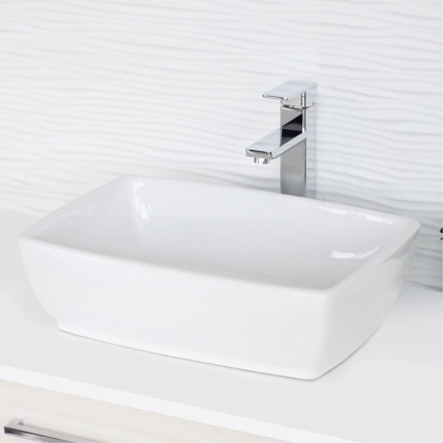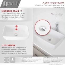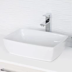 Forget about drilling, holes on the walls, confusing tools and all the mess. Install this over the counter bathroom sink vessel on your own right away. Its standard drain opening works with most pop-up drains. Coordinate this rectangular ceramic sink with any faucet vessel or wall mount faucet. Piece of cake.