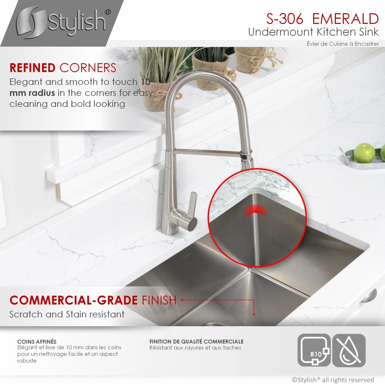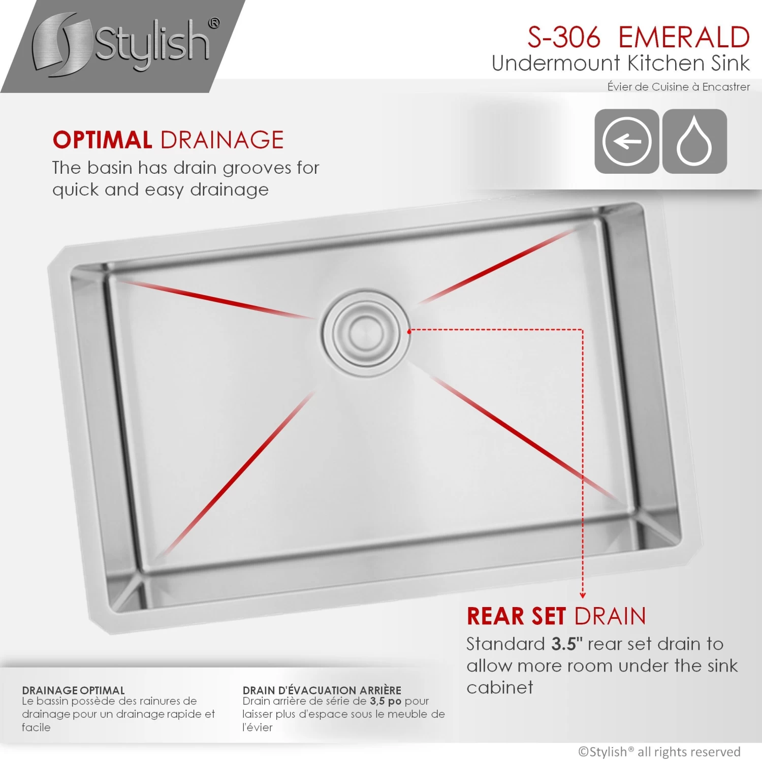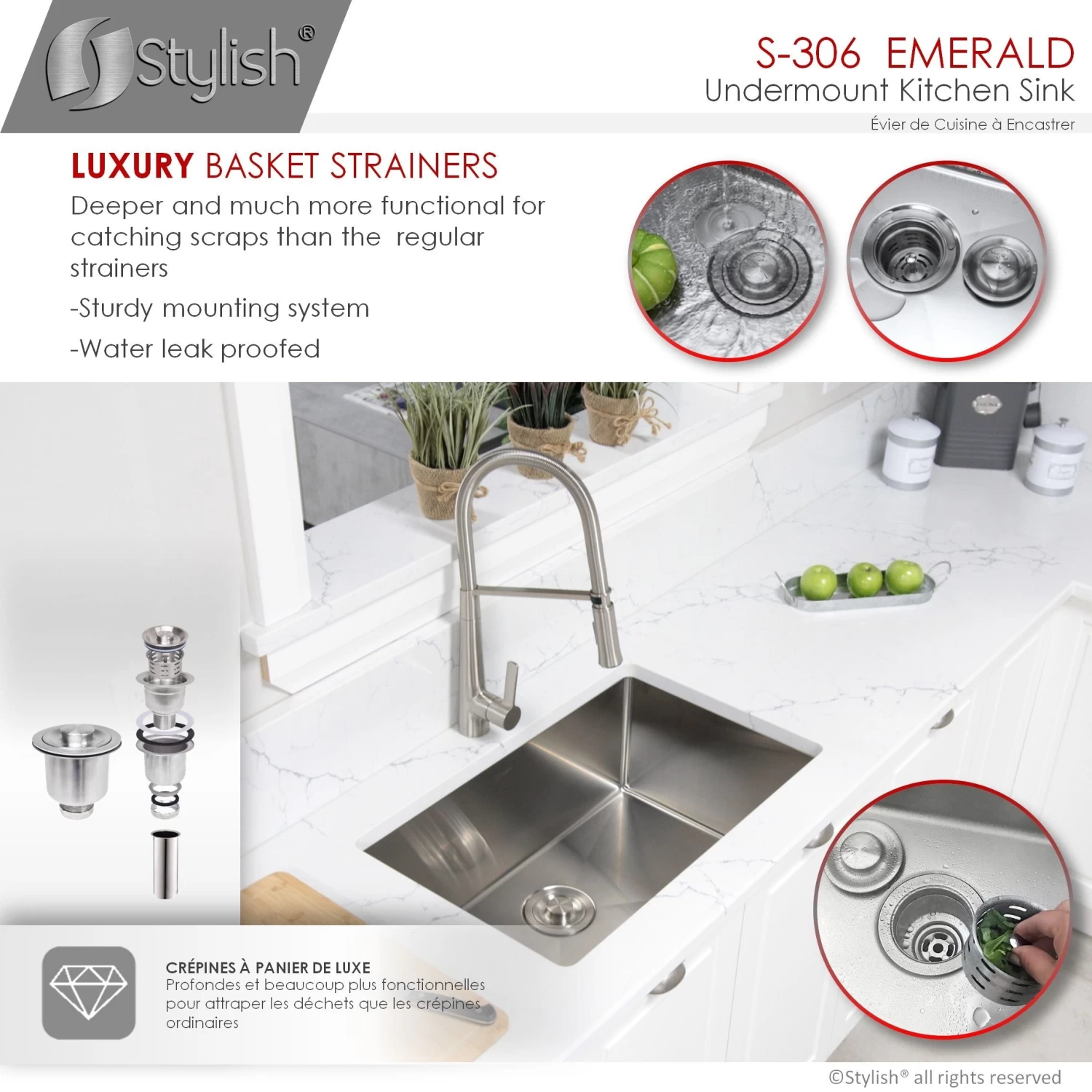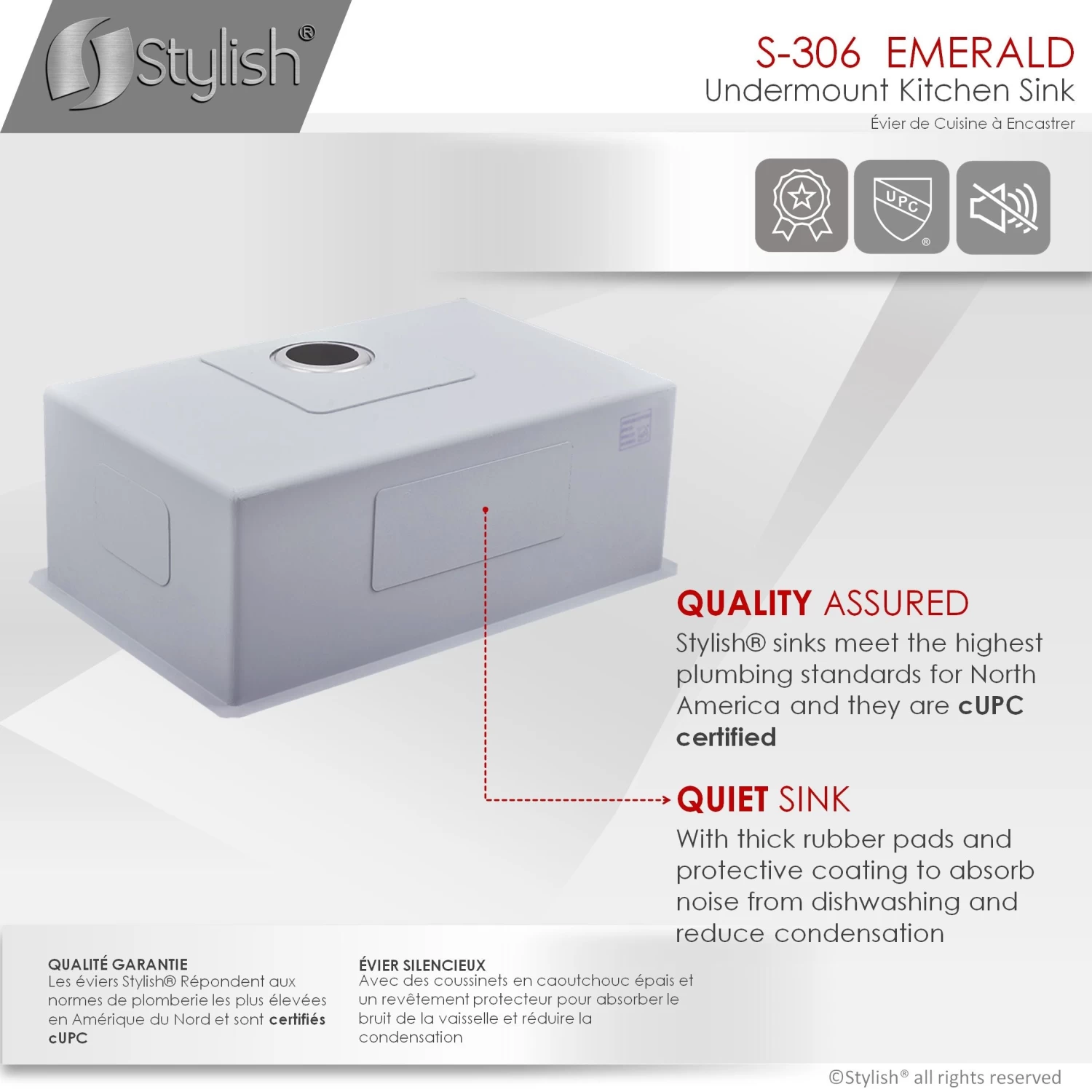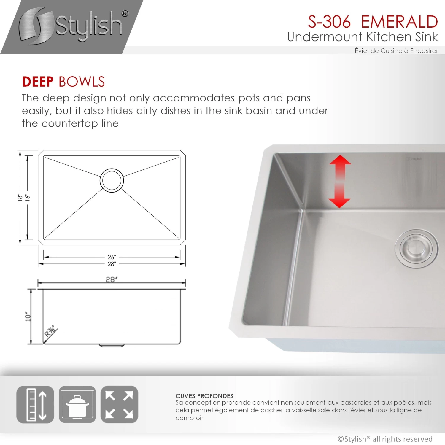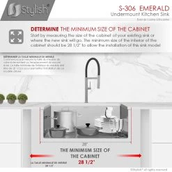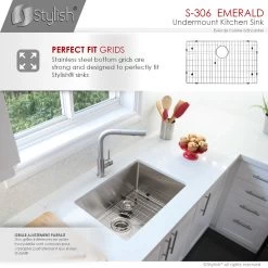 Create a sophisticated kitchen look with our Styluxe Sink Series. Featuring this 28″ x 18″ Undermount Kitchen Sink. This stainless steel kitchen sink includes one luxury basket strainer and one bottom grid made of 100% stainless steel which will really help to protect your sink from dents or scratches. Handcrafted using premium 304 stainless steel with 16 gauge and 18/10 chrome/nickel content and featuring a refined brushed finished. This undermount kitchen sink has the drain towards the rear, for better utilization of the space under the sink cabinet. Also, the stainless steel kitchen sink basin has drain grooves for optimal drainage. This handmade stainless steel sink combines functionality, quality, and affordability. The tight 10mm radius corners are perfectly blended through an automated machine buffing system, and careful hand polished, for a luxurious finish. This undermount kitchen sink is equipped with top-level soundproofing, including thick rubber dampening pads. Each sink is additionally treated with protective coating, which reduces condensation and further dampens sound. The corrosion-resistant surface is further protected from rust and oxidation by a meticulous finishing process. Commercial-grade satin finish and gently rounded corners make maintenance as simple as wiping the surface with a damp cloth. For easy installation, all mounting hardware is provided. Our sinks are Canadian designed and meet the highest plumbing standards of North America. Stylish sinks are trusted by architects and builders for upscale projects and modern makeovers.