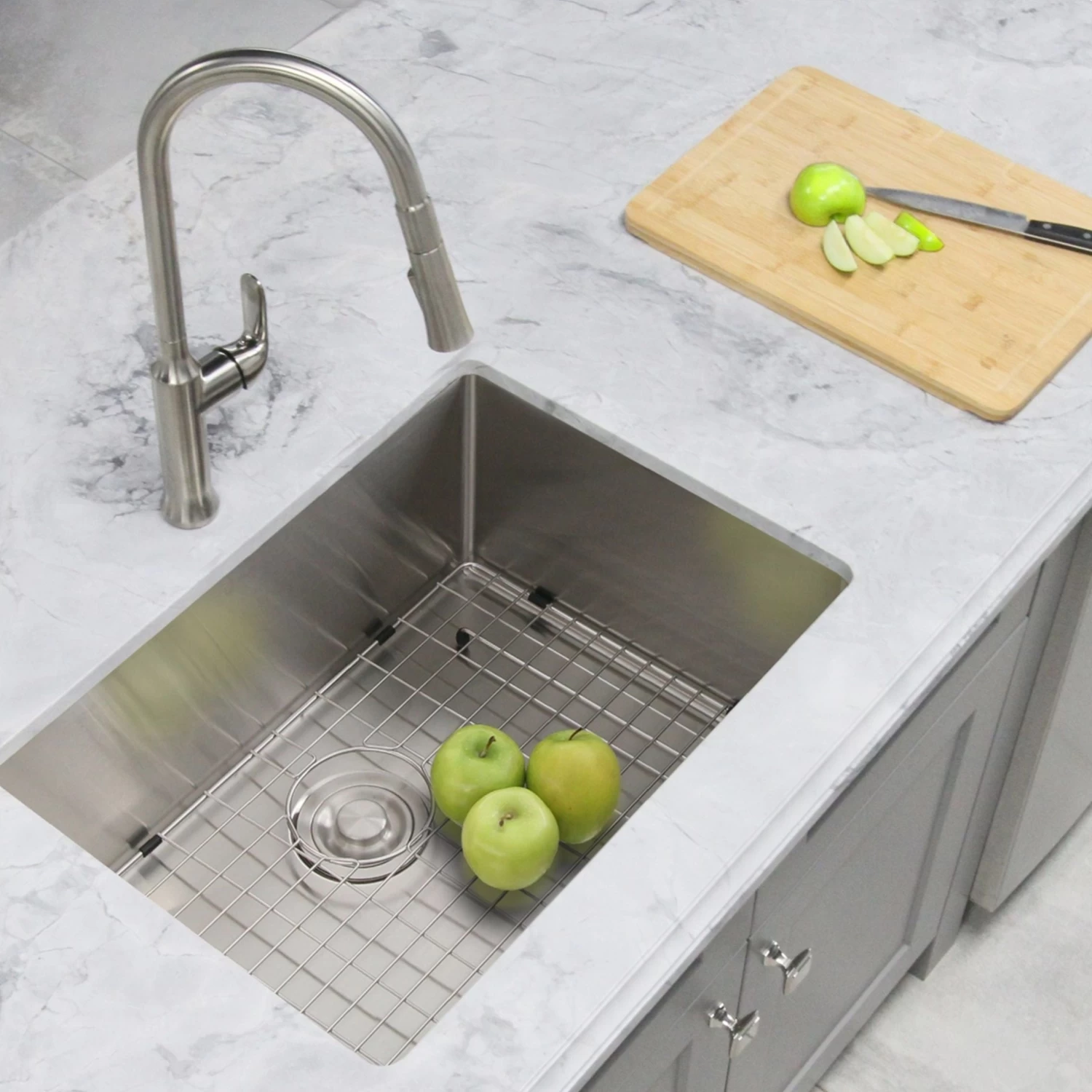 This undermount single bowl kitchen sink comes with a luxury stainless steel basket drain strainer, which is deeper and much more functional for catching scraps and food waste than the regular strainers. The basket strainer keeps food and debris form clogging the drainage.