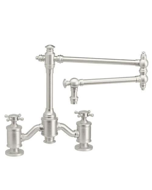 The Towson Bridge Faucet blends a vintage classic style with modern technology and design. The long reaching 18″ articulated spout and two-handled cross design is made from eco-friendly solid brass for a lifetime of durability. The traditional style Bridge Faucet mounts to the sink or kitchen countertop and has an built-in diverter for connection to optional side spray. The double ergonomic handles are ADA compliant. Part of the Towson Traditional Suite, our Bridge Kitchen Faucet can be matched in finish and style to any Waterstone traditional style accessory. Sink side sprayer, garbage disposal air switch, dishwasher air gap or soap/lotion dispenser. Sink hole covers available to cover that unsightly third hole. Two styles of decorative handle buttons included. This timeless traditional design is available in 32 elegant finishes and has a lifetime functional warranty.